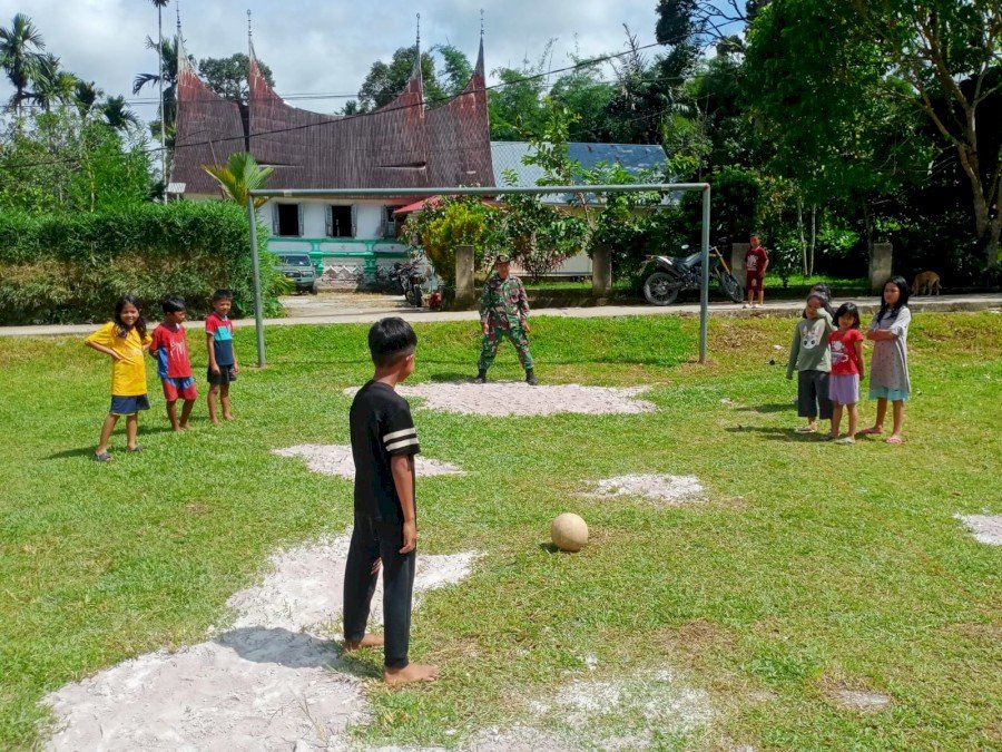 Keceriaan ini terlihat saat beberapa anak setempat dengan antusias menendang bola bersama seorang anggota TNI yang mengenakan seragam loreng lengkap dengan sepatu bot hijau. Suasana penuh keakraban ini semakin menghangatkan hubungan antara warga dan Satgas Pra-TMMD yang tengah bertugas membangun akses jalan demi meningkatkan kesejahteraan masyarakat.
