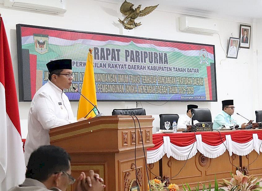 PEKATNEWS.COM- Wakil Bupati Kabupaten Tanah Datar, Ahmad Fadly membacakan jawaban Bupati atas Pandangan Umum Fraksi-fraksi di Dewan Perwakilan Rakyat Daerah (DPRD) terkait paparan Rencana Pembangunan Jangka Menengah Daerah (RPJMD) tahun 2025-2029 di depan Sidang Paripurna yang digelar pada Jumat 11 Juli 2025 di Aula gedung setempat.