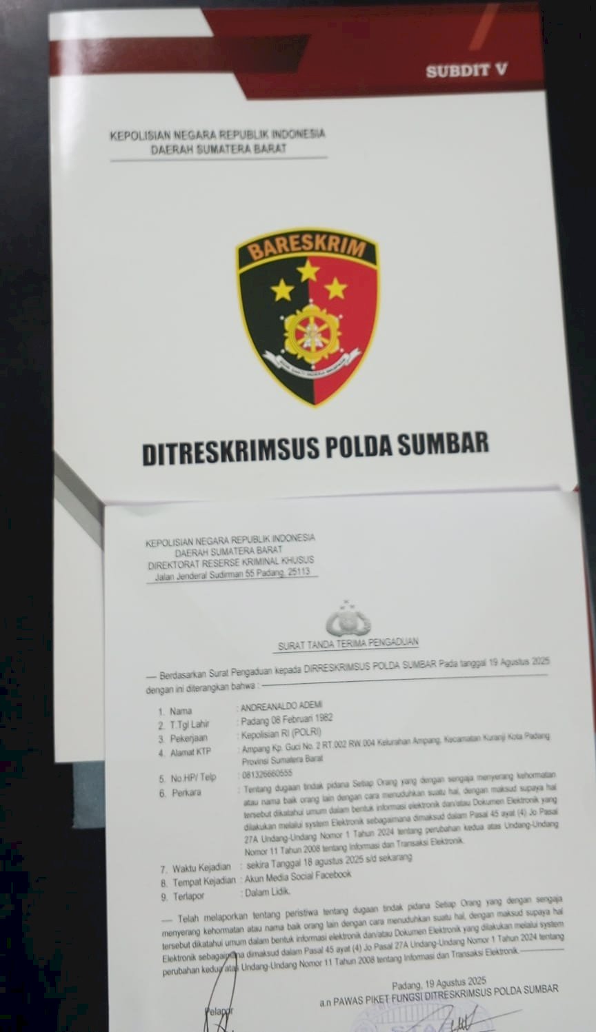 Laporan diterima Bripda Alanda Putra, Pawas Piket Fungsi Ditreskrimsus Polda Sumbar, pada Senin, 18 Agustus 2025.